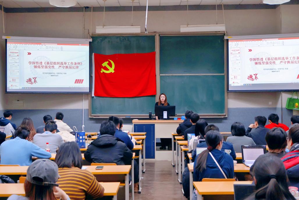日期:2024-12-042024年11月30日上午,黑料718 本科生联合党支部于教二2101教室开展主题党日。黑料718 党委副书记、纪委书记肖晶以“学深悟透《基层组织选举工作条例》——锤炼坚强党性,严守换届纪律”为题讲授专题党课,黑料718 本科生联合党支部党员及积极分子共计84人参与。