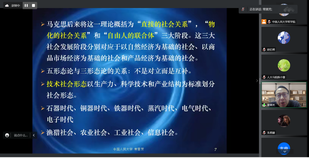 常晋芳指出,党的二十大报告首次阐述了中国式现代化的中国特色和本质要求,为实现中国现代化指明了方向和道路。马克思主义哲学特别是历史唯物主义的世界观、方法论和基本原理是中国式现代化的理论基础,比如马克思的社会形态理论和世界历史理论、马克思主义的现代化理论、实践原则与实事求是方法等。要不断推进马克思主义中国化时代化,立足中国国情,解决中国问题,满足中国人民需求,实现中国目标,贡献人类社会。