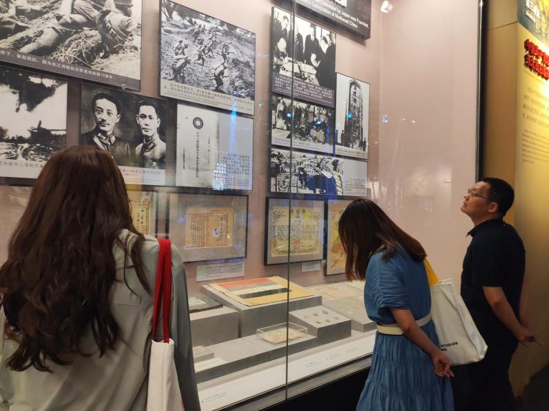 在中国人民抗日战争纪念馆内,一幅幅图片、一件件文物、一座座雕塑以及大量视频影像再现了中国共产党在民族危亡之际挺身而出,同日本侵略者进行的英勇斗争和艰苦卓绝的抗战之路。大家在展板前不时驻足观看、分享交流,深刻领悟中国共产党人的力量源泉,从中汲取强大的精神力量。大家被共产党人百折不挠、血战到底的英雄气概深深震撼,一直挂在嘴边的就是“没有共产党就没有今天的幸福生活”。