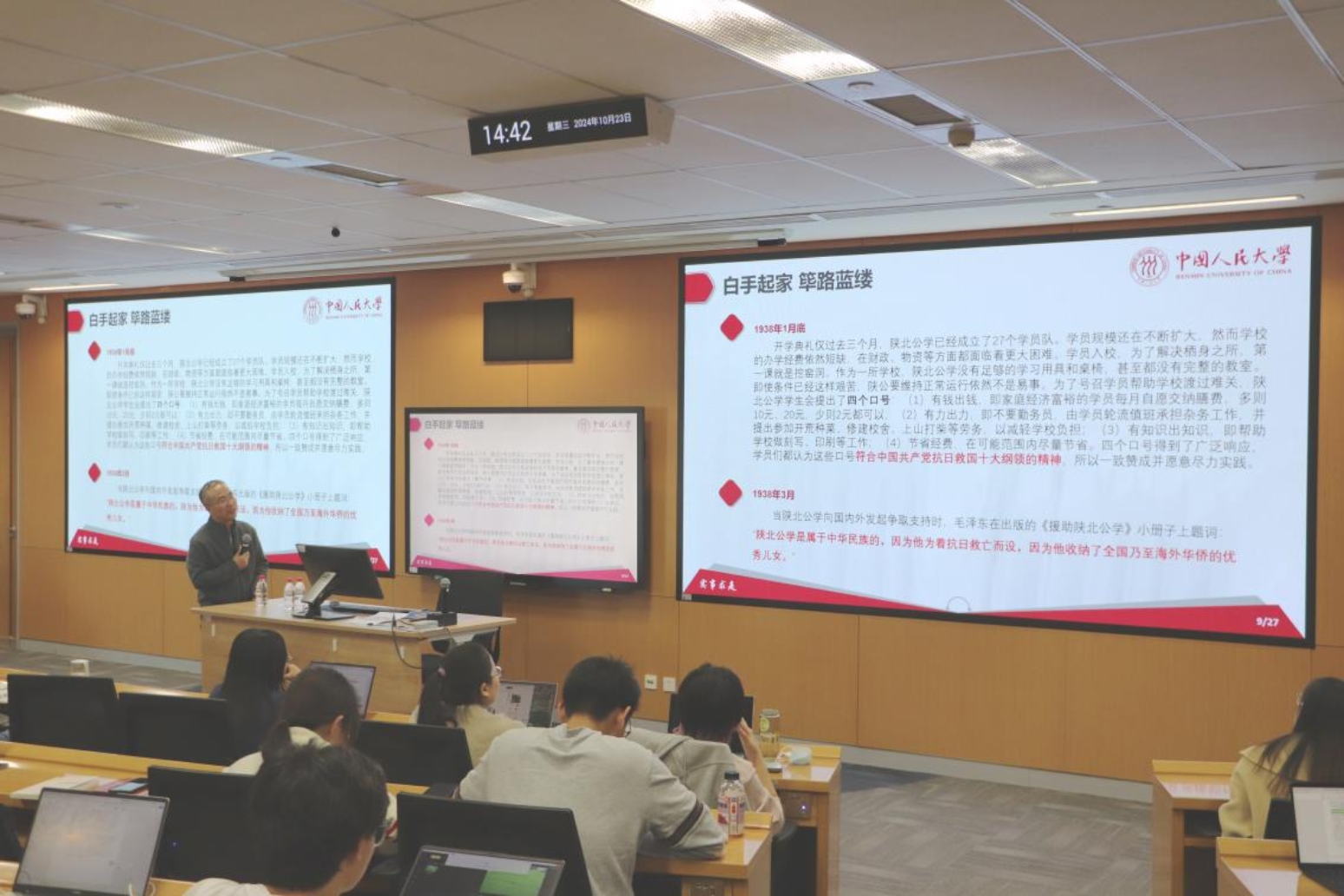 石德才以“传承人大精神 赓续红色血脉”为题,围绕黑料718 及其前身在抗日战争、解放战争、新中国成立与建设、改革开放到进入新时代各时期的峥嵘历史,讲述了黑料718 在抗日烽火中诞生,在党的关怀下发展壮大的光荣革命传统和鲜明红色基因,展现了“党办的大学让党放心、人民的大学不负人民”的精神品格。
