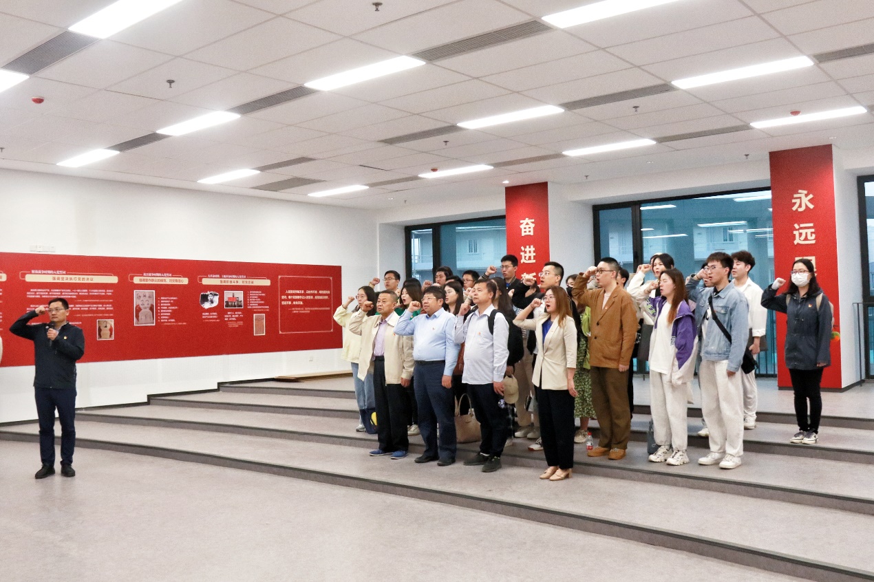 在宣誓厅,党委书记张鹏举作为领誓人,带领学院党员同志们高举右拳,面向党旗重温入党誓词,用庄严宣誓表达对党的无限忠诚与坚定信念。