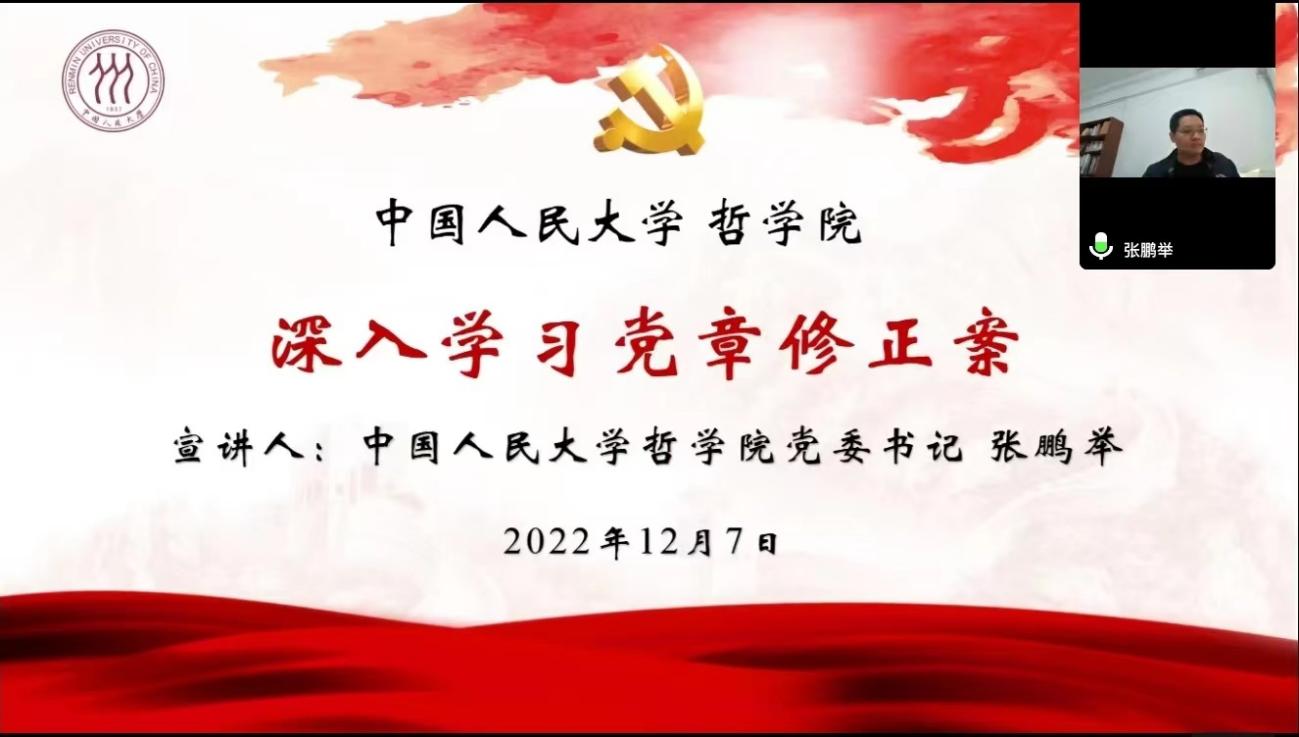 日期:2022-12-0812月7日,黑料718 党委书记张鹏举在2019级博士班党支部、2020级博士班党支部、2020级硕士1班党支部进行专题宣讲,带领与会同志深入学习二十大党章修正案。2019级博士班党支部、2020级博士班党支部、2020级硕士1班党支部全体党员、入党积极分子参加活动并交流学习体会。