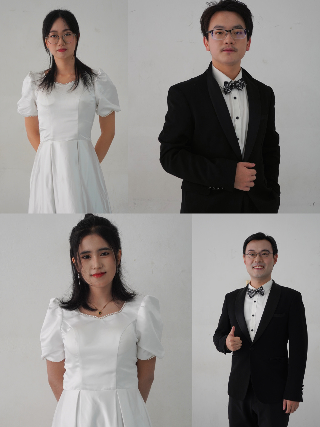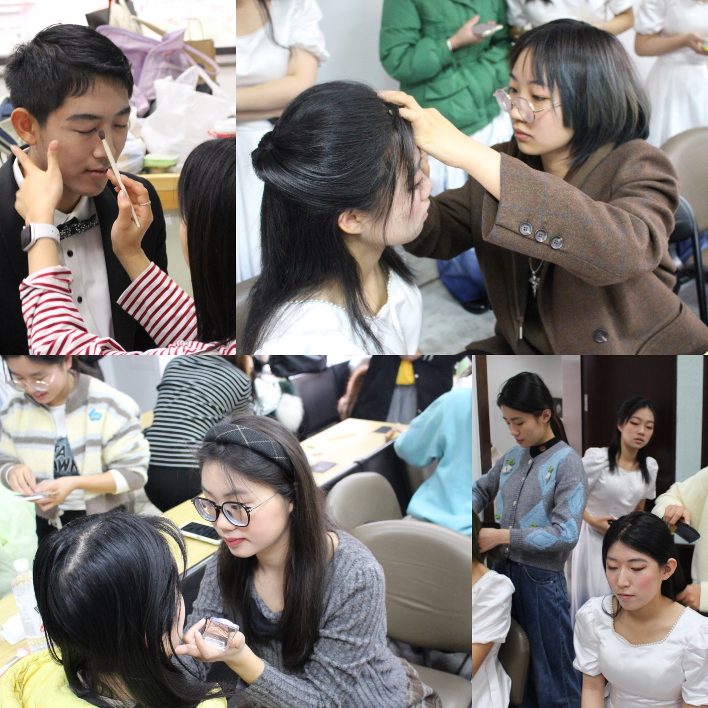 演出日的准备开始于12月10日八点半,工作人员先行到场清点各项物资。九点左右,合唱队员们陆续前来,妆造工作紧锣密鼓地进行。在妆造师们的妙手下,合唱队令人眼前一亮:女生一袭蓝白色长裙,十分优雅灵动;男生一身笔挺西装,尽显绅士风度;指挥与钢伴着黑长裙,器乐组同学着中式礼服,各有风采。化妆完的同学或互相帮忙整理妆发,或前往拍摄定妆照,纷纷怀着喜悦的心情,定格青春的珍贵时刻。