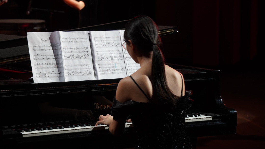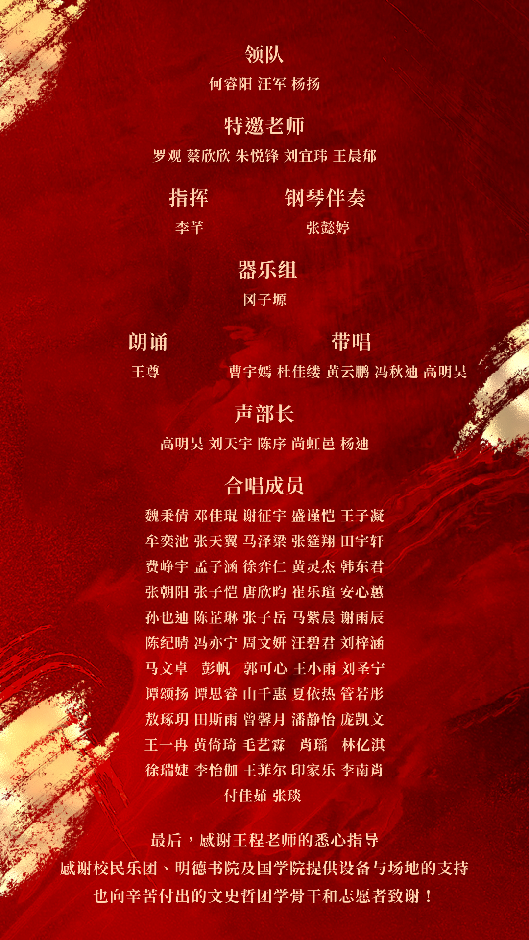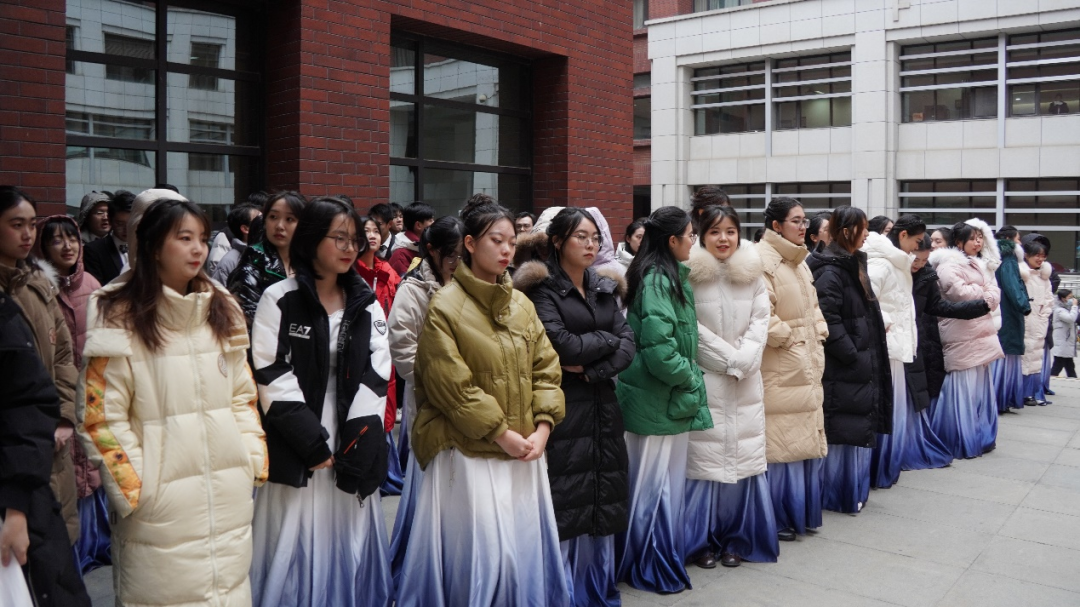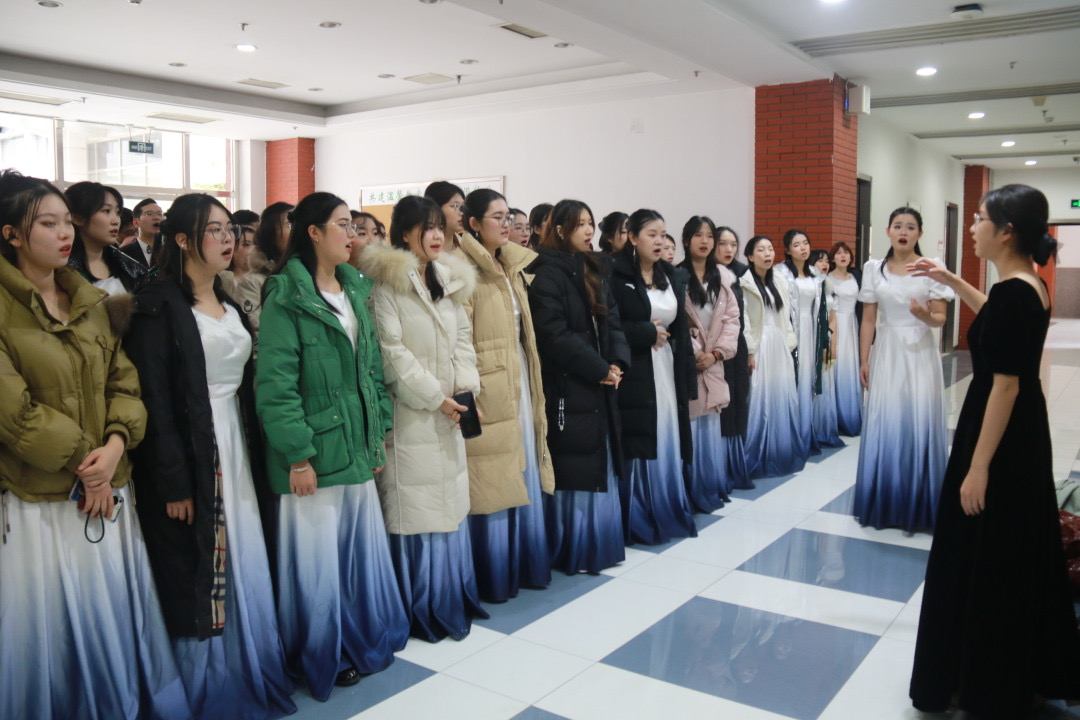 此后,在历史学院曹宇嫣师姐的带领下,队伍像每次日常排练一样认真有序地开声、练唱。台下多日,只为一朝,文史哲全队成员一条心,静待明德堂之上的盛放时刻。