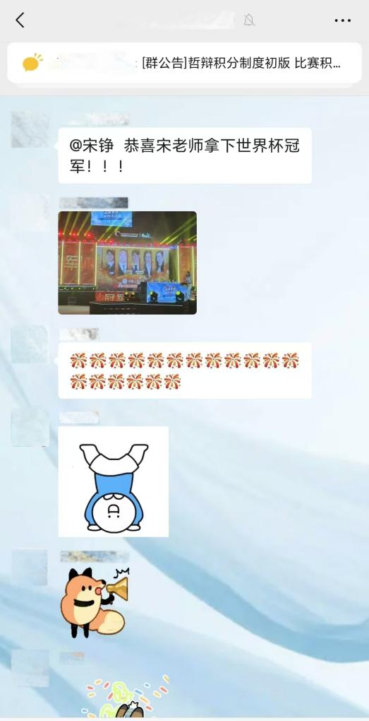 从大一进入哲辩,到大二成为领队,如今担任队长,哲辩无疑承载了宋铮许多重要的回忆。在夺冠后,院队的同学们在微信群里为宋铮庆祝,甚至远在海外交换或留学的同学和师兄师姐也在关注这场比赛,这些支持都化为了他站在决赛舞台上的底气。