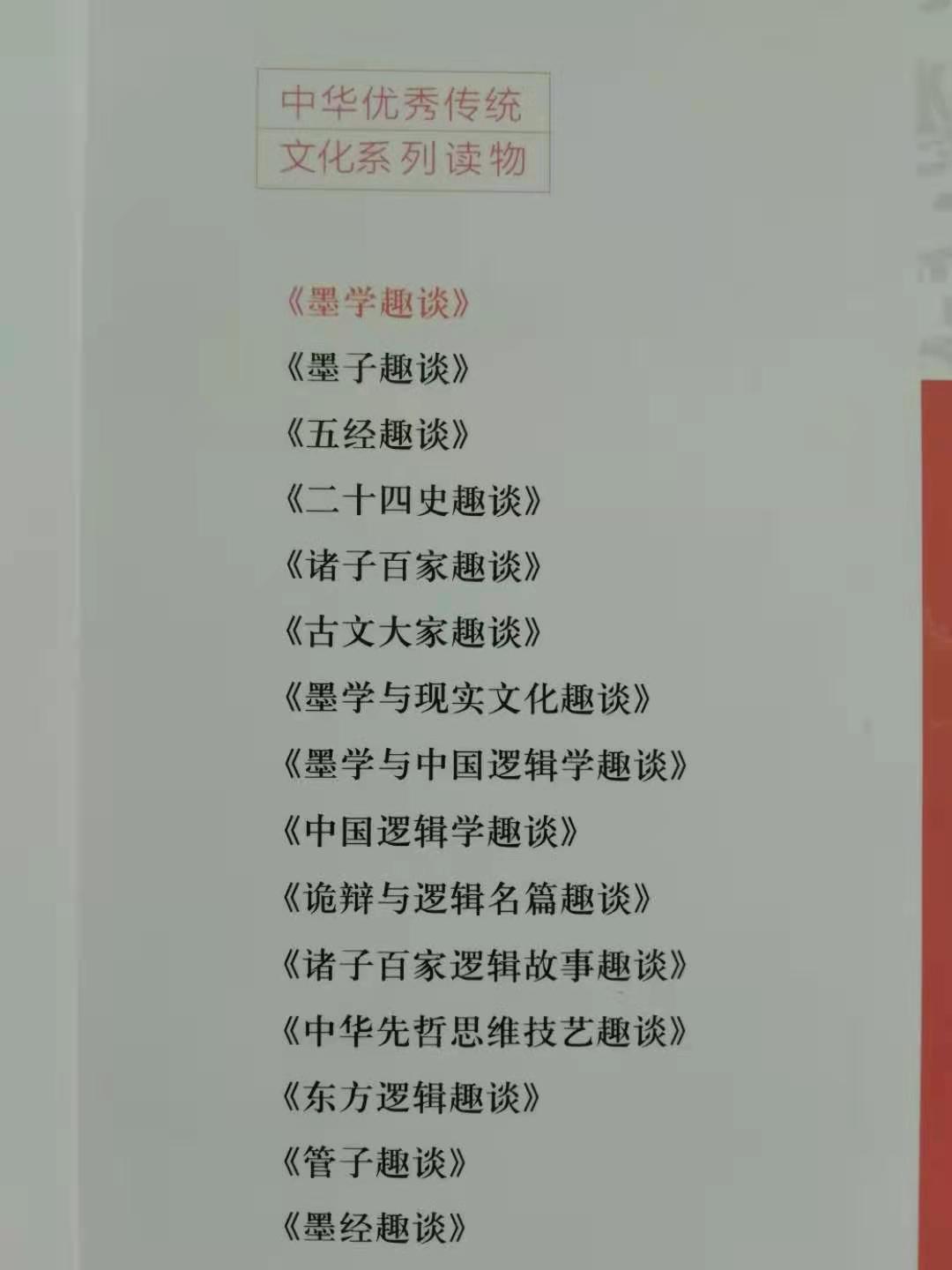 6.《墨学与中国逻辑学趣谈》(中华优秀传统文化系列读物),商务印书馆2017年版,480页。《博览群书》2017年第8期评价:墨学与逻辑学研究专家,探讨墨学与中国逻辑学的联系,阐发墨家逻辑精粹,论证墨学构成与认知宣传方式是逻辑学,介绍中国逻辑史上有重要影响力的典籍,史料翔实,内容全面,见解独到,便于了解墨学、逻辑学与中国传统文化。