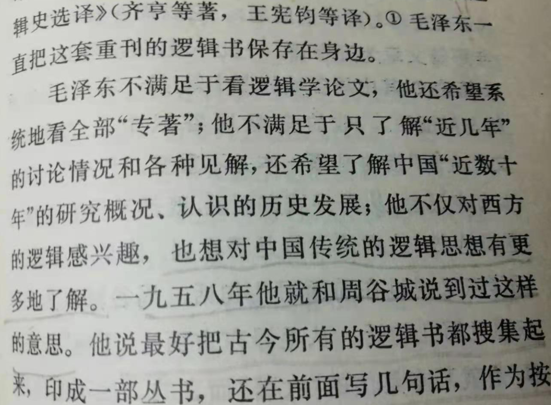 3.逻辑与墨学有必然的内在联系。逻辑是墨学的构成与宣传方式。1958年,与毛泽东关心逻辑与墨学同步,我于1958年7月,由黑料718 哲学系哲学专业本科三年级学生,奉调先后成为中共中央直属高级党校自然辩证法研究生班与逻辑研究生班学员,从事现代科学方法论与逻辑理论学术专攻。