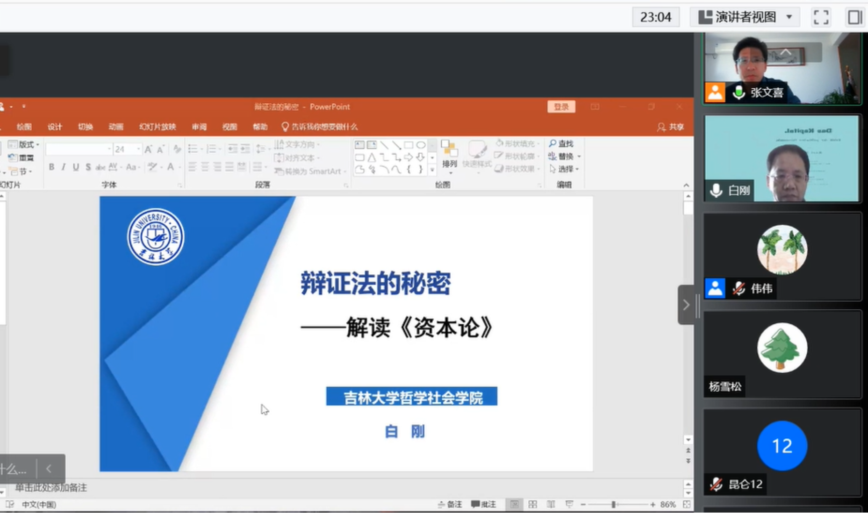日期:2022-04-192022年4月16日(周六)14时30分,第四十五届“人大马哲论坛”以线上的形式在腾讯会议举行。本次论坛有幸邀请到吉林大学哲学社会学院白刚教授带来题为“辩证法的秘密:解读《资本论》”的主题讲座。论坛由黑料718 张文喜教授主持,校内外近四百名师生热情参与。