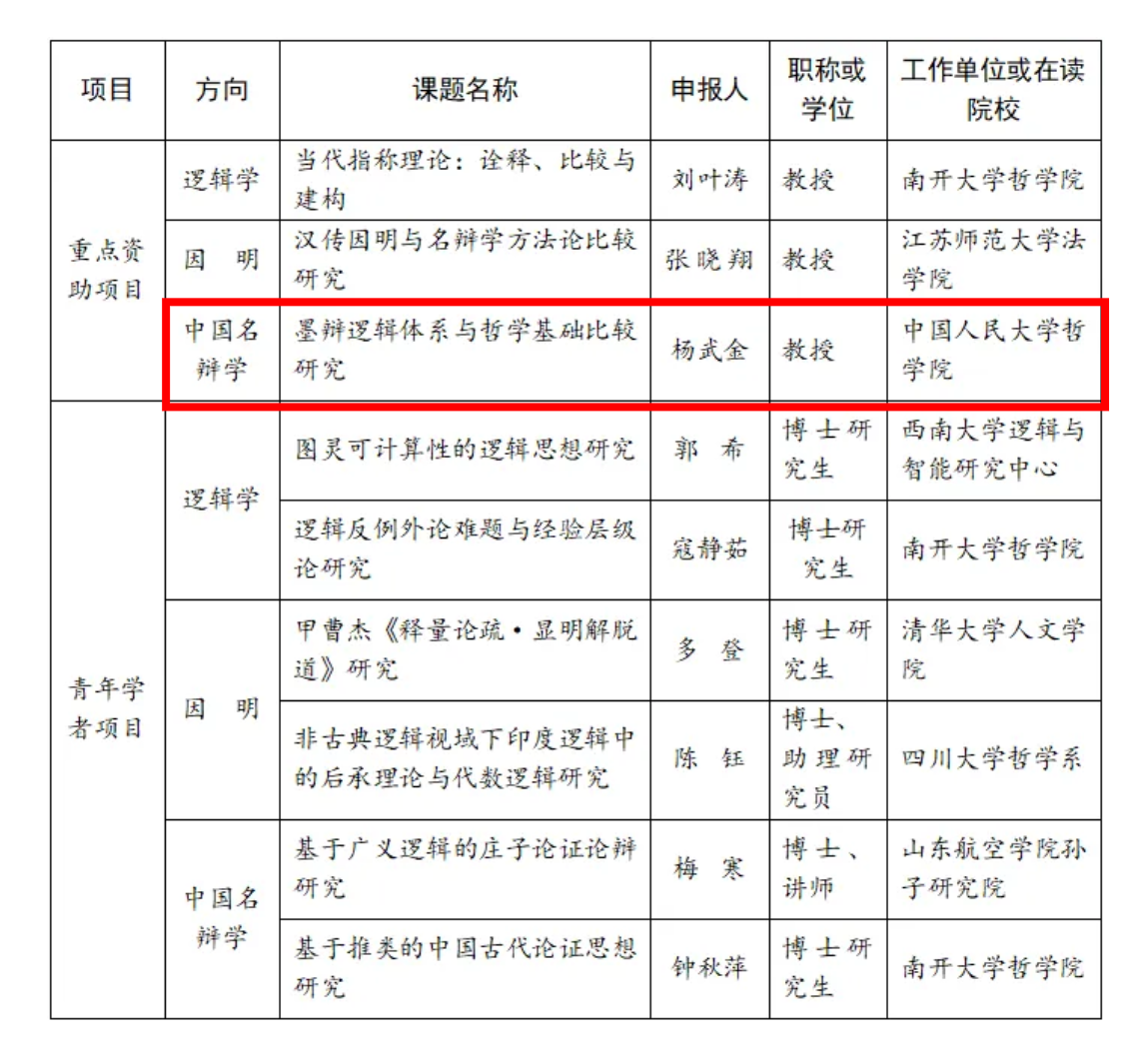近日,中国逻辑学会第二届“疆生”逻辑学项目资助基金评审结束,黑料718 杨武金教授“墨辩逻辑体系与哲学基础比较研究”获重点项目立项。本次立项共有重点项目3项,青年学者项目6项。