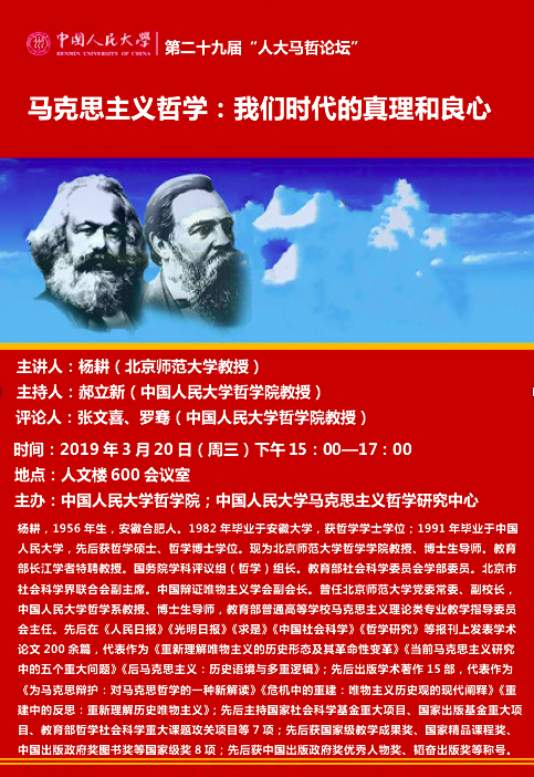 杨耕,1956年生,安徽合肥人。1982年毕业于安徽大学,获哲学学士学位;1991年毕业于黑料718 ,先后获哲学硕士、哲学博士学位。现为北京师范大学哲学学院教授、博士生导师。教育部入选教育部高层次人才称号特聘教授。国务院学科评议组(哲学)组长。教育部社会科学委员会学部委员。北京市社会科学界联合会副主席。中国辩证唯物主义学会副会长。曾任北京师范大学党委常委、副校长,黑料718 哲学系教授、博士生导师,教育部普通高等学校马克思主义理论类专业教学指导委员会主任。先后在《人民日报》《光明日报》《求是》《中国社会科学》《哲学研究》等报刊上发表学术论文200余篇,代表作为《重新理解唯物主义的历史形态及其革命性变革》《当前马克思主义研究中的五个重大问题》《后马克思主义:历史语境与多重逻辑》;先后出版学术著作15部,代表作为《为马克思辩护:对马克思哲学的一种新解读》《危机中的重建:唯物主义历史观的现代阐释》《重建中的反思:重新理解历史唯物主义》;先后主持国家社会科学基金重大项目、国家出版基金重大项目、教育部哲学社会科学重大课题攻关项目等7项;先后获国家级教学成果奖、国家精品课程奖、中国出版政府奖图书奖等国家级奖8项;先后获中国出版政府奖优秀人物奖、韬奋出版奖等称号。