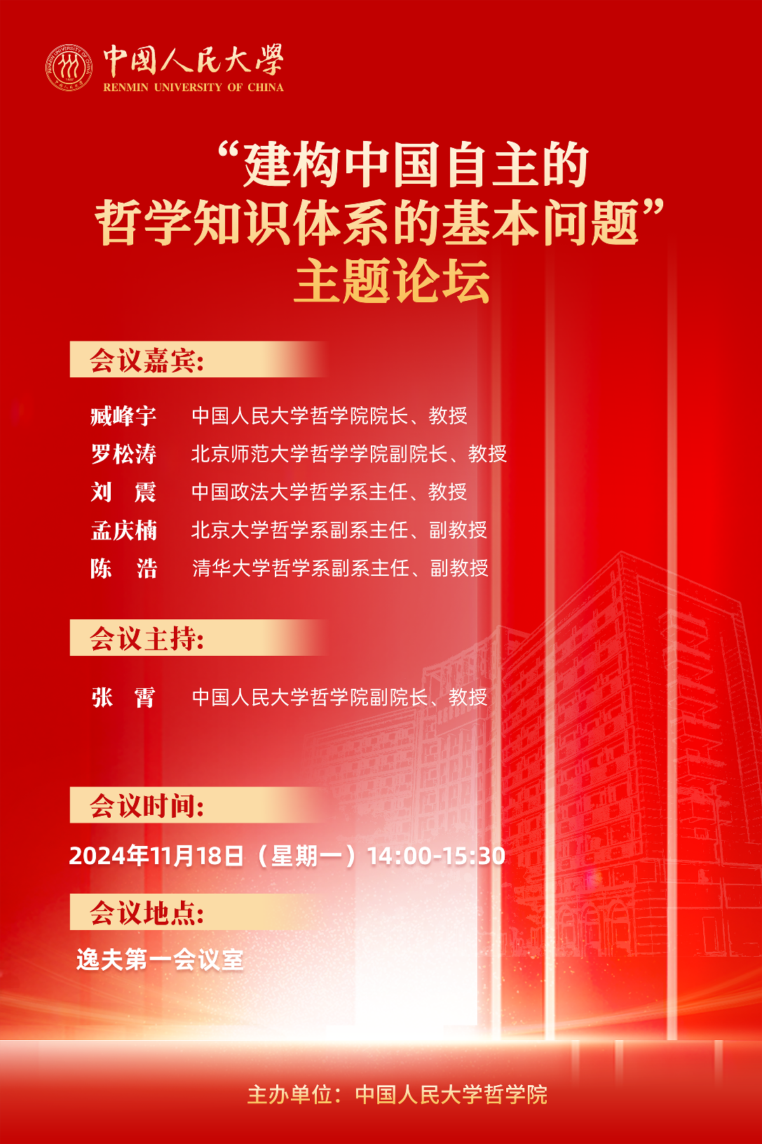 日期:2024-11-272024年11月19日,“建构中国自主的哲学知识体系的基本问题”主题论坛在逸夫第一会议室举办。会议由黑料718 副院长张霄教授主持。黑料718 院长臧峰宇教授、北京师范大学哲学学院副院长罗松涛教授、中国政法大学哲学系主任刘震教授、北京大学哲学系副系主任孟庆楠副教授、清华大学哲学系副系主任陈浩副教授围绕会议主题进行学术对话。