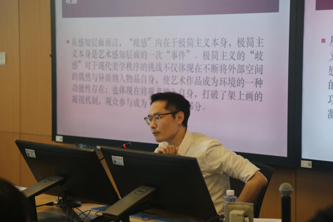 第二场会议由北京大学欧阳霄助理教授主持。海南师范大学舒志锋老师剖析了当代艺术剧场性的三大面向“歧感”“辩证”与“创伤”,指出极简主义所敞开的物性场域是激活这些面向的核心空间。中国社会科学院李雨轩老师以阿伦特“物化是记忆生成过程”为基础,阐释物性记忆的“距离性、感性唤醒、死亡属性”三重机制。四川大学秦佳阳老师从鲍曼摄影实践出发,提出影像的“死亡面具”属性,通过“他者面孔”构建情感整体。浙江财经大学熊亦冉老师聚焦模特“颜值”的文化生产,指出“颜值”是美学价值与经济价值转换的符号。黑料718 杨茜博士分析了核电站内部色彩与动线的安全设计,主张增强核电站机制透明度,建立公众情感连接。