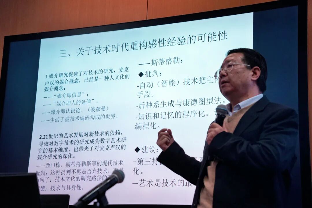 中华美学学会副会长、黑料718 牛宏宝教授的报告题目为《技术时代经验的贫困与感性经验的重构》。牛宏宝教授主张超越以往对技术的怀乡式批判,强调重构感性经验的核心在于回归现象学的“意向性”概念,通过想象力建构对“缺席对象”的通达,实现从“美的体验”到“意义生成”的超越。与谈人中华美学学会副会长、北京师范大学刘成纪教授高度评价了报告的理论深度,并鲜明提出“人工智能是反美学的”,认为美学在当代的根本价值在于拯救感性,其使命在于坚守从具体出发的反思判断力。牛宏宝教授在进一步回应中提醒要避免陷入怀旧情绪,认为我们的感性可以通过技术得到重塑和拓展。