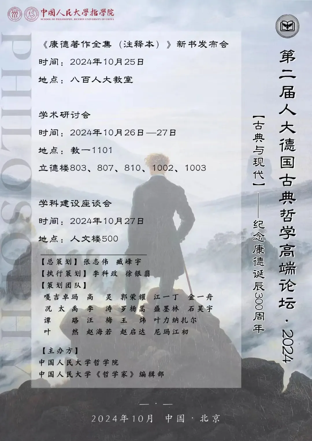 日期:2024-10-302024年10月26日上午8:40,“第二届人大德国古典哲学高端论坛”学术研讨会开幕式在黑料718 公共教学一楼1101隆重召开。来自北京大学、清华大学、复旦大学、武汉大学、浙江大学、山东大学、中山大学、北京师范大学、中央民族大学、四川大学、东南大学、吉林大学、华中科技大学、湖南大学、暨南大学、中国政法大学、上海财经大学、安徽大学、贵州大学、湖北大学、陕西师范大学、湖南师范大学、东北师范大学、南京师范大学、四川师范大学、安徽师范大学、西安电子科技大学、浙江理工大学、长安大学、南昌大学、北方工业大学、中共中央党校(国家行政学院)、中共北京市委党校(北京行政学院)、中共上海市委党校(上海行政学院)等高校,以及中国社会科学院、天津社会科学院、四川省社会科学院、江苏省社会科学院、吉林省社会科学院、上海社会科学院等科研院所,更有来自香港新亚研究所哲学所、台湾辅仁大学、台湾“中央”大学、澳门大学、台湾大学等港澳台高校与科研院所的100余位专家学者参加了开幕式。