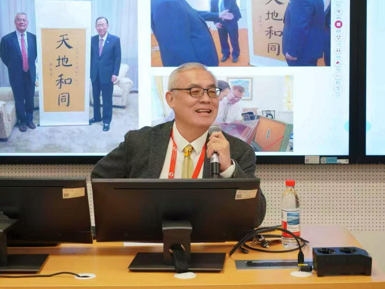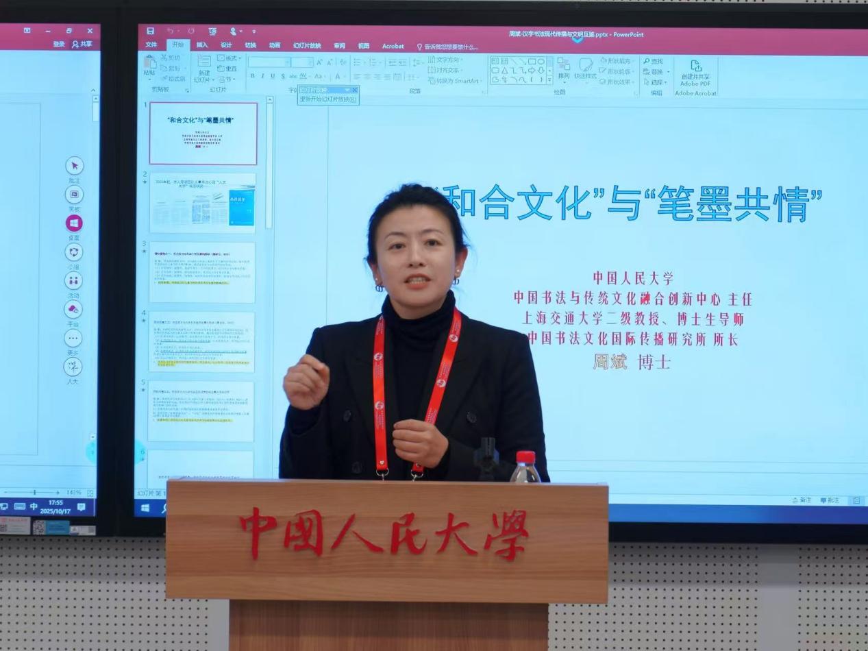 周斌教授以“和合文化与笔墨共情”为主题,通过实证研究展示了中国书法在促进全球文明互鉴中的独特价值。周斌教授团队历经多年的纵向研究发现,书法练习对儿童发展具有显著促进作用,这些科学结论为书法的人文价值提供了实证支持。基于自己在书法研究领域多年的经验和在联合国教授联合国秘书长潘基文书法的十年经历,周斌教授进一步指出,书法作为“和合文化”的重要载体,因其兼具雅、俗文化的双重特质,成为中华文化国际传播的有效媒介。通过笔墨纸砚的简约形式,书法将中国哲学中的“和合”智慧转化为可感知、可体验的艺术实践,为不同文化背景的受众理解中华文明提供了一条独特路径,在当代文明交流中展现出独特的共情力量。
