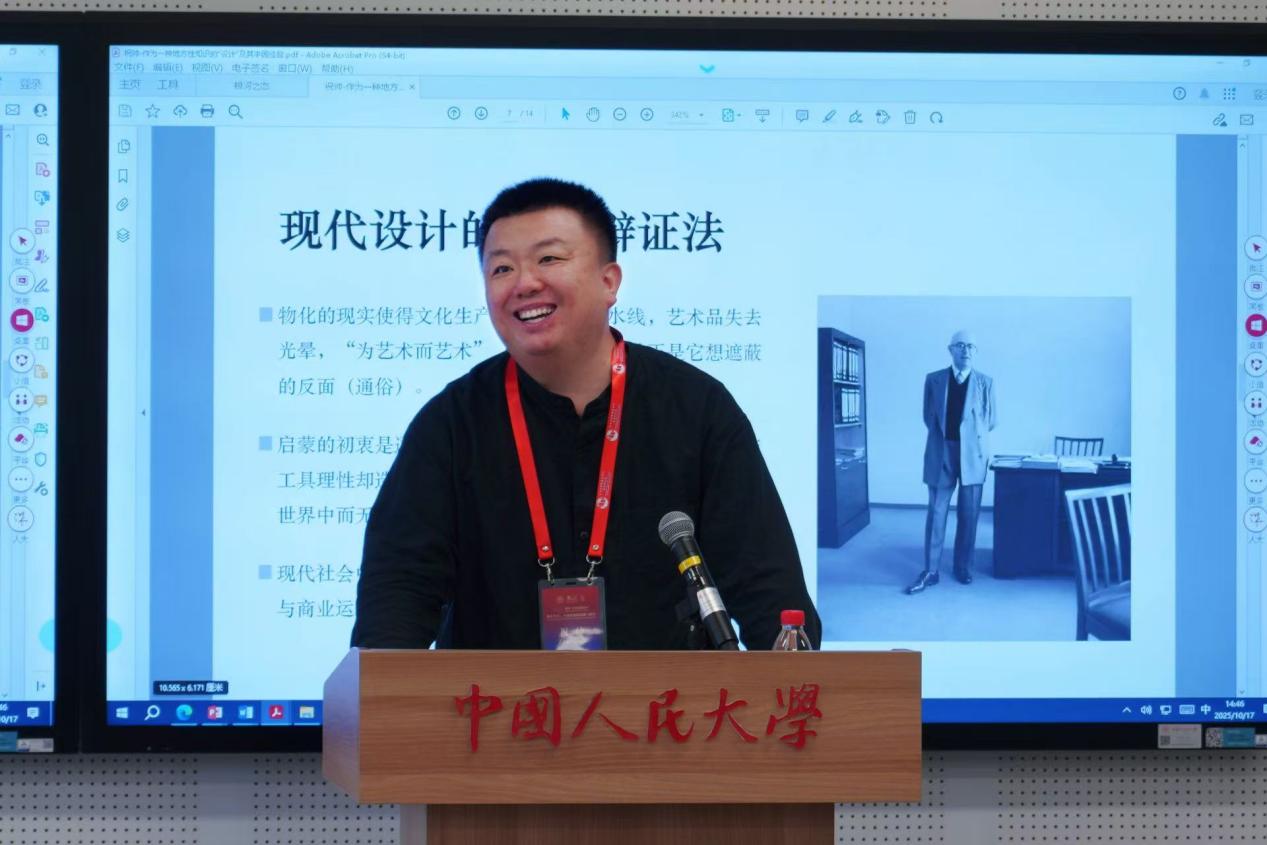 祝帅教授以“作为一种地方性知识的‘设计’及其中国经验”为题,从世界博览会与现代设计理念入手,揭示了现代设计的物化现象。他指出,工业产品一方面使其自身成为了一个审美对象,另一方面在越发全球化的同时也失去了很多地方特色。现代主义作为一种时代的生产方式,有其存在价值和意义,但另一方面,我们也对现代主义的审美产生了反思和改变的想法。他以中国传统民居建筑和服装给我们的启示为例,对中国设计何以可能进行思考,进而,他援引金岳霖先生的哲学之问,指出设计作为一门交叉学科,应该具有地方性色彩。他强调,设计知识在人文维度本质上是“地方性”的,中国设计作为中国式现代化的缩影,我们应旗帜鲜明地提出中国设计的观念,建立中国设计的学派。