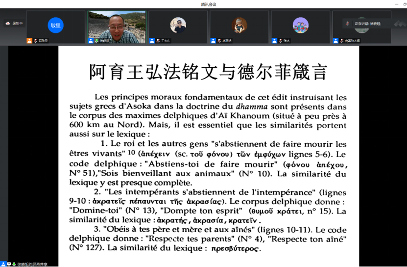 1966年和1977年间,法国赴阿富汗考古队(DAFA)在阿富汗东北部边境地区的阿伊·哈努姆(Ai Khanoum)希腊化城市遗址中发掘到的铭文和纸草构成了古代希腊人在中亚从事哲学活动的直接证据,徐晓旭的讲座围绕着讨论和介绍这些考古发现展开。