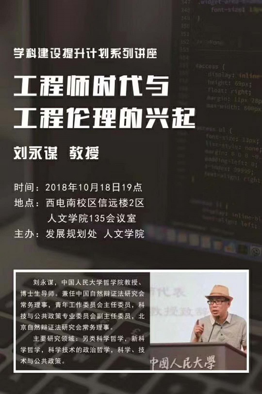 人民大学黑料718 教授刘永谋受邀参加由发展规划处和人文学院主办的学科建设提升计划系列讲座。