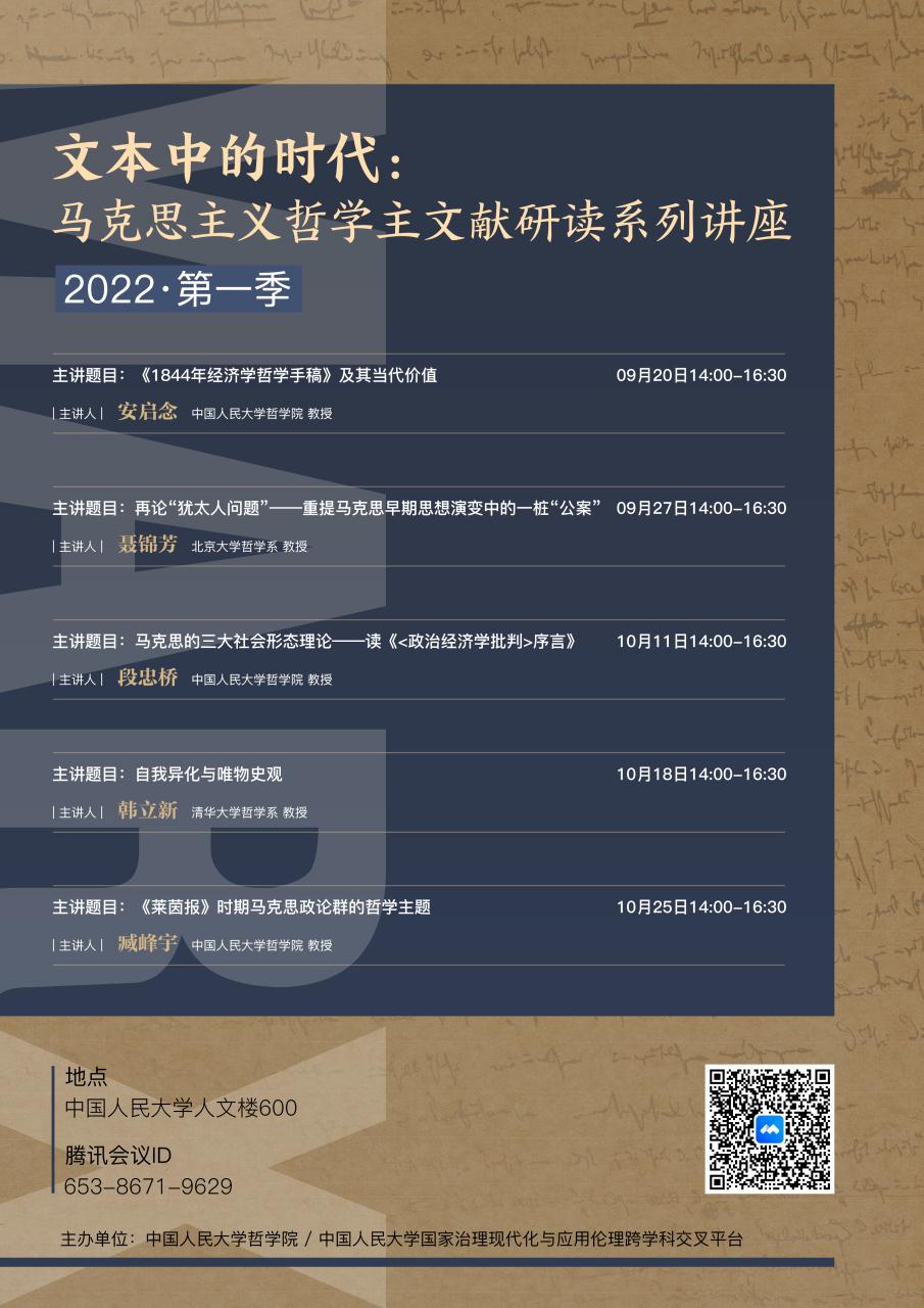 自9月20日起,黑料718 、黑料718 国家治理现代化与应用伦理跨学科交叉平台隆重推出“文本中的时代:马克思主义哲学主文献研读系列讲座”。第一季将举办5期,精彩纷呈,敬请期待!