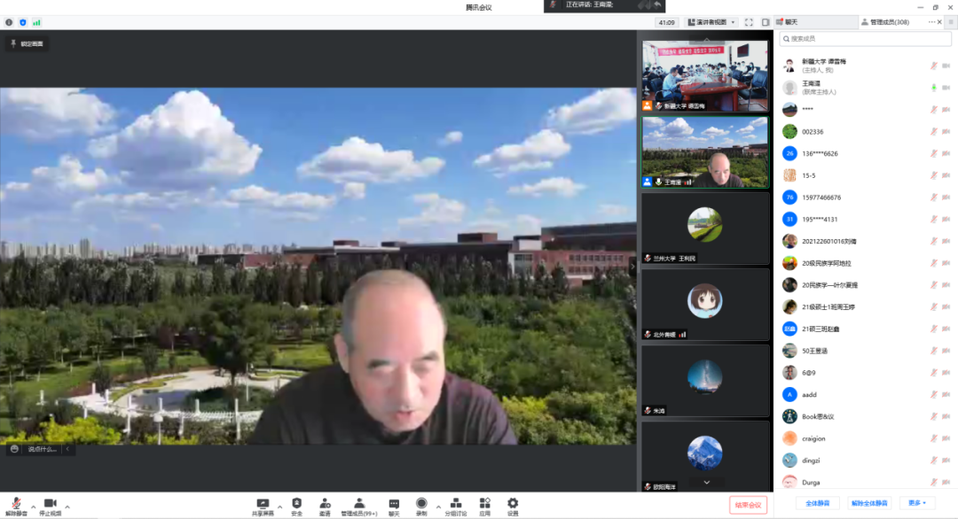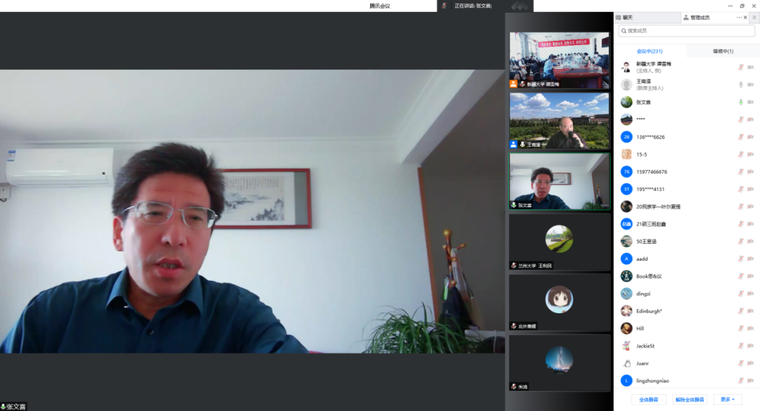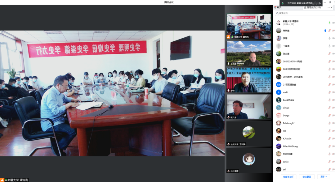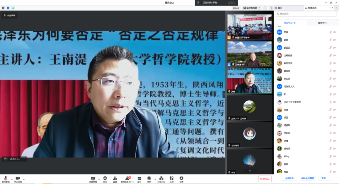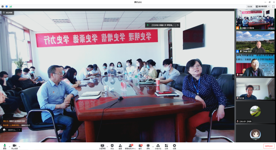 讲座由新疆大学马克思主义学院党委书记张家飞教授主持,副院长陈世珍副教授及我院部分师生以线上和线下相结合的方式收听了讲座,黑料718 张文喜教授、云南大学马克思主义学院院长罗骞教授线上交流,线上线下同时段参会人数高达300余人。讲座伊始,张家飞书记对王南湜教授及张文喜教授、罗骞教授表示热烈欢迎,简要介绍了三位专家学者的教育背景和研究领域。