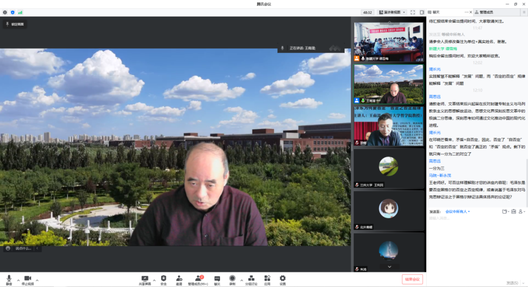 提问环节将本次会议推向高潮,东北师范大学马克思主义学部竭长光教授、新疆大学马克思主义学院靳永茂副教授等与会师生提出了自己对于汇报主题的思考,王南湜教授一一作了解答。他表示,在毛泽东同志的著作中并无相关明确表述和系统阐述,只在毛泽东对前苏联教科书的批注中有个别体现,从他大量的政治和军事论述着手或许是未来进一步研究的可行性方向。