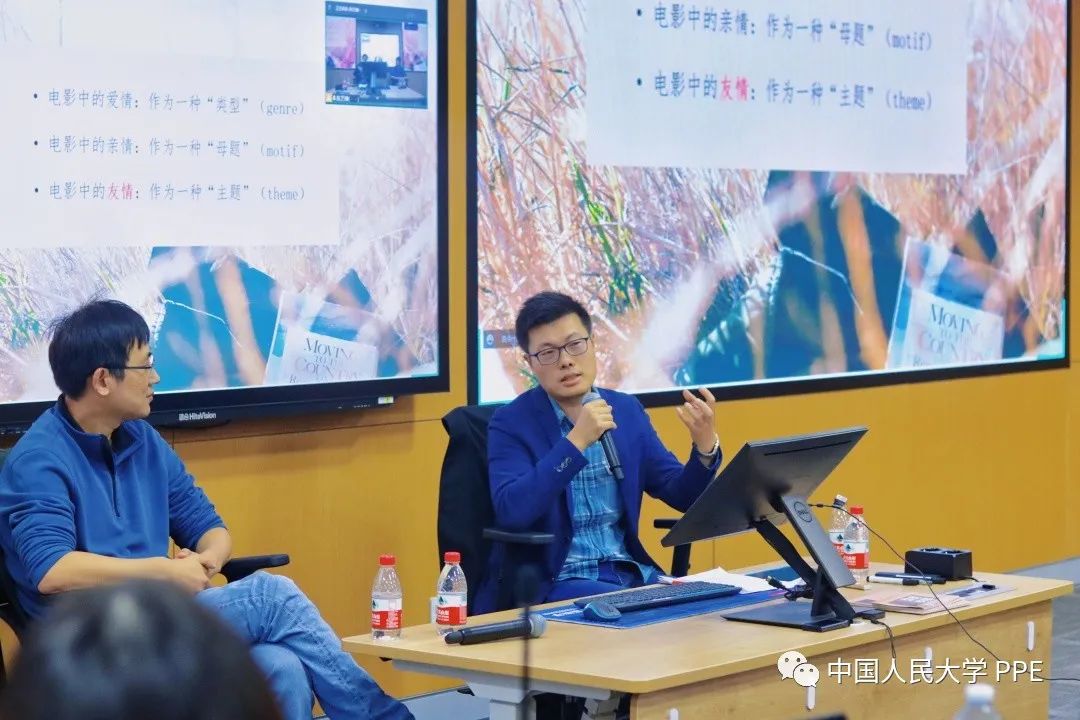 接下来,通过一部两分钟的短片,陈涛老师向同学们展示了影视中的经典友情片段。陈老师就当代电影中的“友与德”向同学们介绍了不同文化背景中影片对“友情”主题的展现。他指出,电影中的爱情是一种“类型”(genre),电影中的亲情是一种“母题”(motif),而电影中的友情是一种区别于母题和类型的“主题”(theme),故而往往不会被明显地呈现在电影中。陈老师以《迷离杀人事件》、《坏孩子的天空》与《白蛇2:青蛇劫起》三部电影为例,分析了友谊在影片中反映的、更加深刻的主题与内涵。总的来说,友与德的冲突在电影中起到了表现社会良知、同性情谊以及充当自我镜像的作用。陈老师强调,电影是一种“艺术再现”,而并非现实的反映,但其与社会语境息息相关,必须结合历史背景去理解。