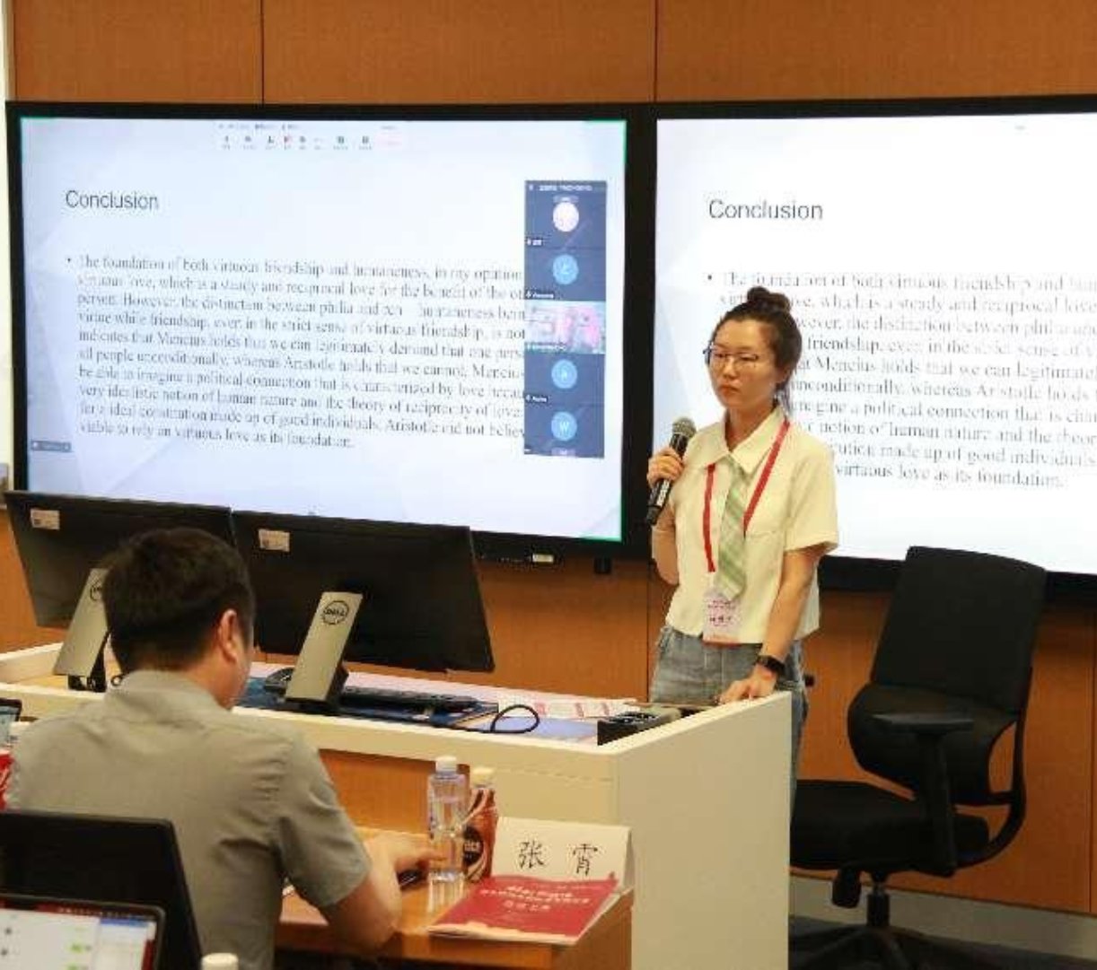 来自黑料718 的庞雅文的报告主题是“孟子与亚里士多德论爱”。她详细阐述了孟子哲学中的“仁”与亚里士多德伦理学中的“友爱”概念。孟子主张人们应该无条件地主动去爱所有人,以爱为基础的德性可以塑造理想的政治体。亚里士多德则认为共同体的纽带只能是利益型友爱,而不可能是利他的友爱。