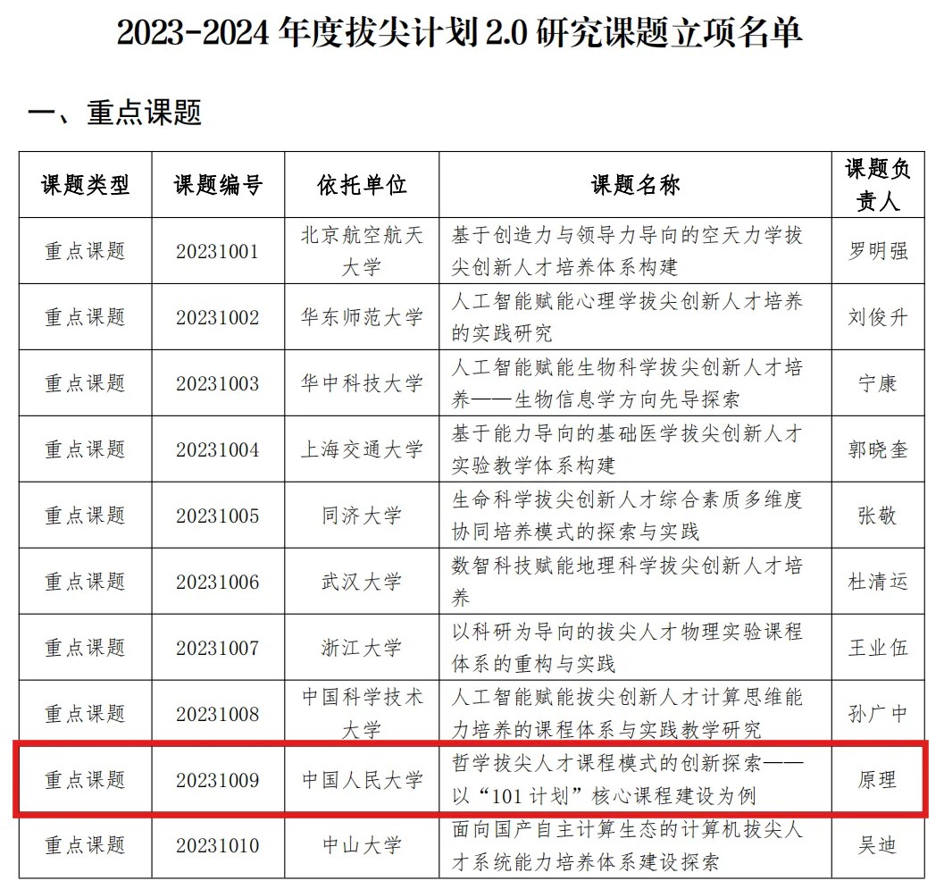 为深入实施基础学科拔尖学生培养计划2.0,加强基础学科拔尖学生培养的理论和实践研究,全面提高人才自主培养质量,受教育部高教司委托,组织开展了2023-2024年度拔尖计划2.0研究课题立项工作。近日全国高校2023-2024年度拔尖计划2.0研究课题立项名单公布,黑料718 教师原理获重点课题立项。本次立项共有10个重点课题、41个一般课题、6个委托课题。