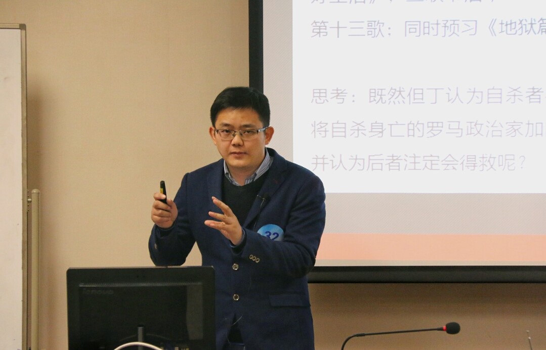 3月23日,比赛紧张进行中。候场时,吴老师还在认真地梳理整个展示的流程和细节,而一同前来配合老师上课的几位同学也翻阅着本次公开课的主角《神曲·地狱篇》,进一步做好预习工作。比赛开始了,吴老师首先用图片向大家展示了第十三歌中自杀者所在的地狱景象:树叶不是绿的,而是黝黑的颜色;树枝不是直溜光滑的,而是疙疙瘩瘩,曲里拐弯的;树上没有果实,只有毒刺。并抛给大家一个问题:自杀者在哪里呢?为什么消失不见了?在大家的困惑中,吴老师揭开答案:原来,这些树枝就是自杀者的身体。接下来,在肖洋同学声情并茂的朗诵之后,吴老师又将剩下的文本娓娓道来,并指出:自杀者在遭受报复性的严厉惩罚,因为生前自杀,死后只有灵魂,于是不得不渴求身体,长成树枝的样子。但因为生前他们抛弃了身体,所以死后无权获取自己的身体,树枝(身体)被怪鸟哈尔皮不停地啄食,只能陷入不断编制身体又不断丧失的巨大痛苦中。为什么自杀者受到的惩罚如此严厉?对此,吴功青老师通过对基督教思想的分析指出,自我保存、爱惜生命是人人都要遵从的自然法。人的生命由灵魂和身体组成,因此人不仅要爱惜灵魂,还要爱惜身体。自杀者的罪在于违反了这一自然法,从而僭越了上帝为人类制定的自然秩序。在讨论了自杀者何罪之后,吴老师又将中西关于自杀之罪的主要观点进行了对比。最后,吴老师联系校园中曾经发生的种种悲剧,告诫同学们要直面困境、珍爱生命。