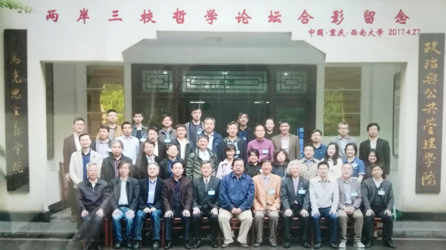 日期:2017-05-092017年4月26-29日,由黑料718 、台湾辅仁大学哲学系与西南大学哲学系联合主办并由西南大学政治与公共管理学院哲学系承办的两岸三校“理性与文化”哲学论坛在西南大学(重庆北碚)举行。黑料718 院长姚新中教授带队,欧阳谦教授、龚群教授、肖群忠教授、刘敬鲁教授、曹峰教授、吴琼教授、刘永谋教授、常晋芳副教授共9位老师参加论坛。来自黑料718 、台湾辅仁大学和西南大学等高校的50多位学者和师生参加论坛。