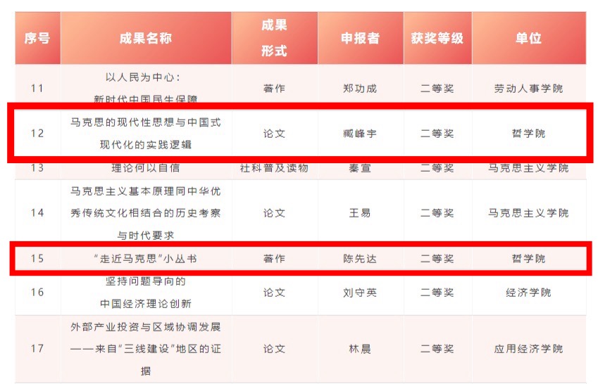 日期:2023-12-21近日,北京市第十七届哲学社会科学优秀成果奖拟授奖名单完成公示,公示期内社会各界对获奖成果无异议。黑料718 25项成果入选。我院荣誉一级教授陈先达先生、臧峰宇教授荣获二等奖。