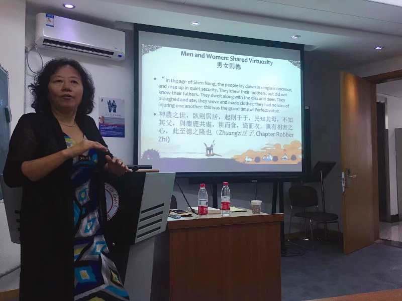 第三场讲座的时间是在6月5日下午,由李记芬博士主持,罗安宪教授担任评议人,题目为“当代哲学的视野:以性别为例”。讲座围绕“什么造就女性之美(可爱)”、“女性与中国传统文化”、“人性与女性和怎样理解男女有别”、“不同的本性?异化的性别?”等问题展开。在讲座第一部分,根据刘向《列女传》和曹文逸《灵源大道歌》中对于女德和人性问题等的探讨,王蓉蓉教授展示了中国古代思想中女德的真正含义和古代女性为代表的道家思想中强调的性命双修的含义。讲座第二部分进一步讲了在中国园艺思想(Gardenly thinking)视角下可以如何进一步探讨性命双修的问题。而在讲座第三部分,以LuceIrigary对女性和人性关系的理解为例,王教授则进一步探讨了中国女性思想与西方女性思想的一致性和其背后的本体意义。罗安宪教授就中国古代思想中的女德问题和当今世界对女性的态度等问题进行了点评和交流;在与听众互动环节中,王教授也就许多大家感兴趣的话题比如剩女问题等进行了探讨。
