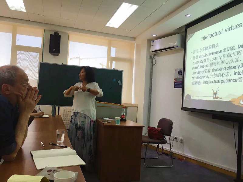 第一场讲座的时间是在6月1日下午,由李记芬博士主持,姚新中教授点评,题目为“复杂性阴阳:为21世纪哲学构建中国学术话语的自主性和独特性”。王蓉蓉教授提出,哲学在21世纪不仅是引经据典的工作,更需要解决这个时代的问题。中国哲学在西方语境中常常遭到误解,道家思想被理解为失败者、自私者的学说。要让中国的文献说自己的话,组建中国自己的话语结构,不能强加西方的观点。而阴阳思维是中国学术的最独特的表达结构,能够运用到理论和实践中去。王蓉蓉教授提出,阴阳思维和阴阳智慧的框架可以应用于六个方面,分别为“矛盾”,“相依”,“互含”,“互补”,“交感”,“转化”。姚新中教授的点评,认为提出哲学方法论的问题更为重要,王蓉蓉教授在打通中西方面做出了重要的贡献。其他参与讲座的老师和同学也纷纷提问和互动。