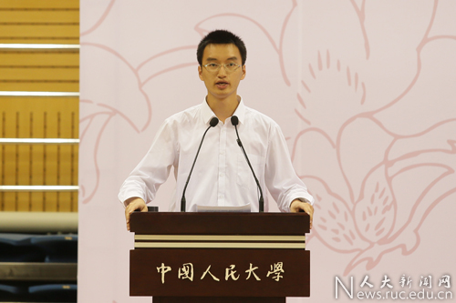 法学院2014级本科生许卓然代表全体新生表达了初入人大的心情与希望。他说,人民大学是认知、完善、发展自我的平台,尽管可能会面对一些困难,但作为新一代优秀的人大学子,一定会立足当下,志存高远,牢记人大人的责任与使命,续写人大的辉煌。