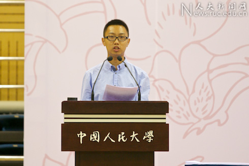 马克思主义学院2011级本科生张冬冬代表全体在校生对新同学表示祝贺和欢迎,代表全体人大学子向辛勤工作的老师们表示感谢。他与大家分享了进入大学后参加“红船领航”新生党员先进性熔铸计划时受到习近平总书记指导与勉励的亲身经历,并以“平常心”与“精英志”两个关键词鼓励同学们牢记人大的历史与传统,肩负起人大人的责任与使命,真正做到“心为平民,行为精英”,成为“国民表率,社会栋梁”。