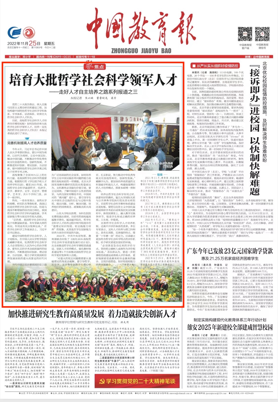 2022年,中共中央宣传部、教育部联合印发了《面向2035高校哲学社会科学高质量发展行动计划》,从全面推进哲学社会科学课程思政建设、创新人才培养模式、强化教材体系建设等5个方面推动高校哲学社会科学更好发挥育人功能。