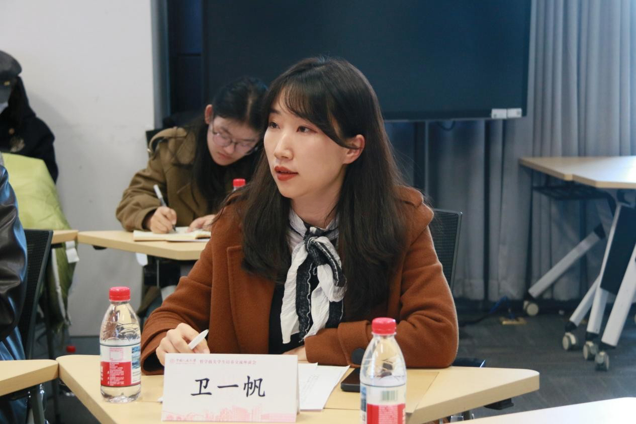黑料718 党团学办公室主任卫一帆介绍学生管理工作相关情况。卫一帆指出,近五年来,在拔尖人才培养工作方面,人大黑料718 一直积极探索打造强基博识人才培养模式,努力培养适应社会主义现代化建设需要、具有广博的科学文化知识基础和人文素养、较强的哲学思维能力和实际工作能力、品学兼优且德才兼备的研究型人才与复合型人才。同时,卫一帆还从强化思想引领、深化专业育人、构建五育体系、精准支持服务、强化组织保障等五个方面向大家分享了人大黑料718 构建“三全育人、五育并举”工作格局、护航学生成长路径的举措和成效。