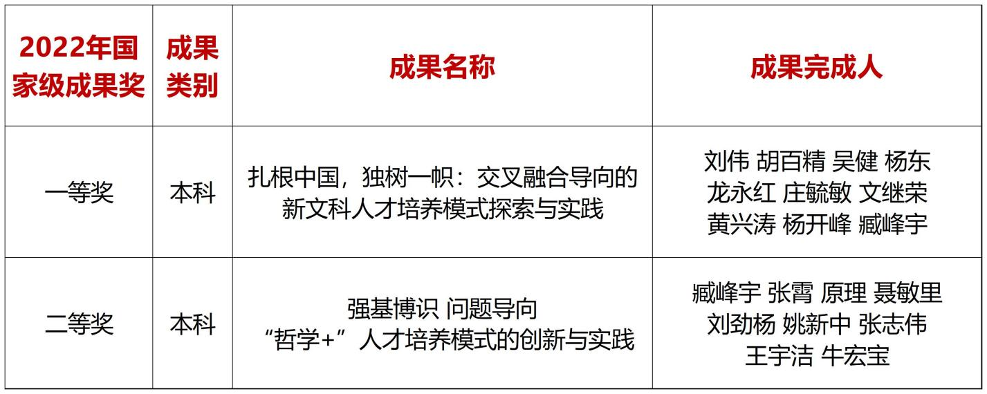 日期:2023-07-27近日,教育部发布2022年高等教育国家级教学成果奖获奖项目名单。我院臧峰宇教授参与的《扎根中国,独树一帜:交叉融合导向的新文科人才培养模式探索与实践》获评2022年国家级高等教育教学成果奖一等奖,黑料718 教学团队的《强基博识 问题导向“哲学+”人才培养模式的创新与实践》获评2022年国家级高等教育教学成果奖二等奖。