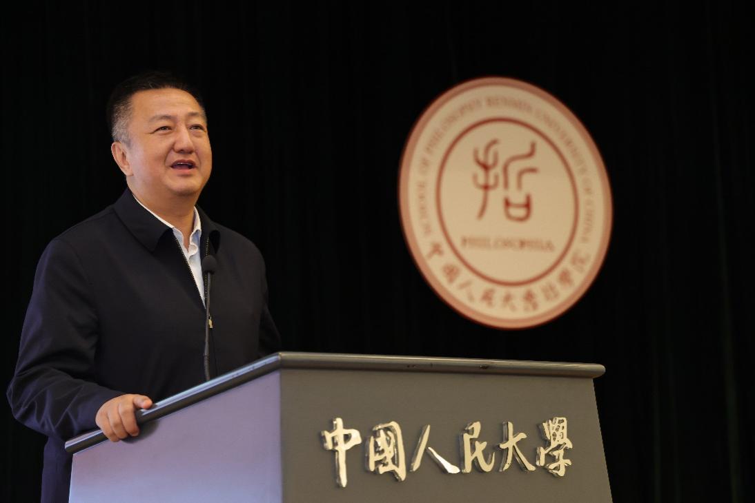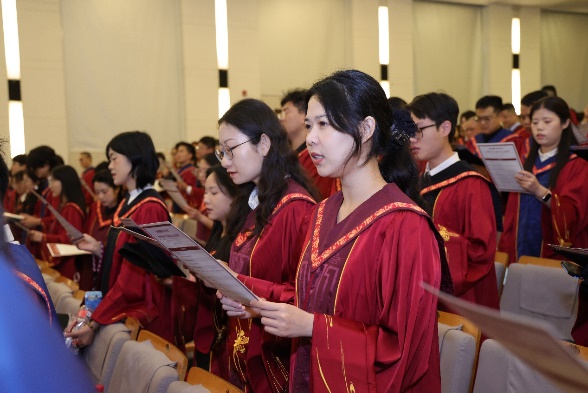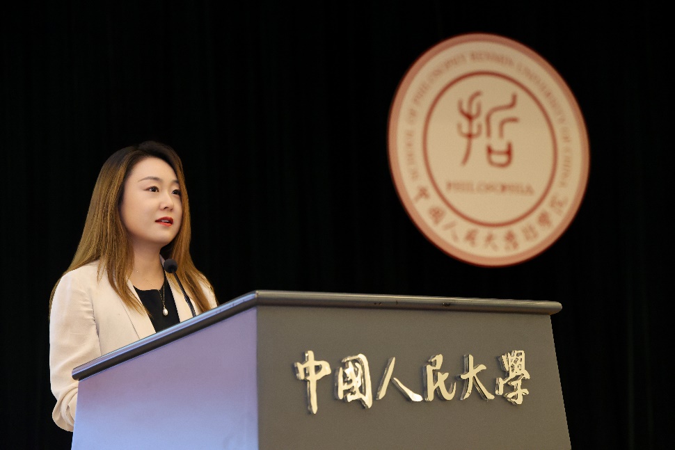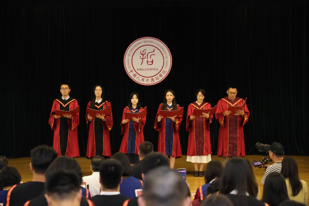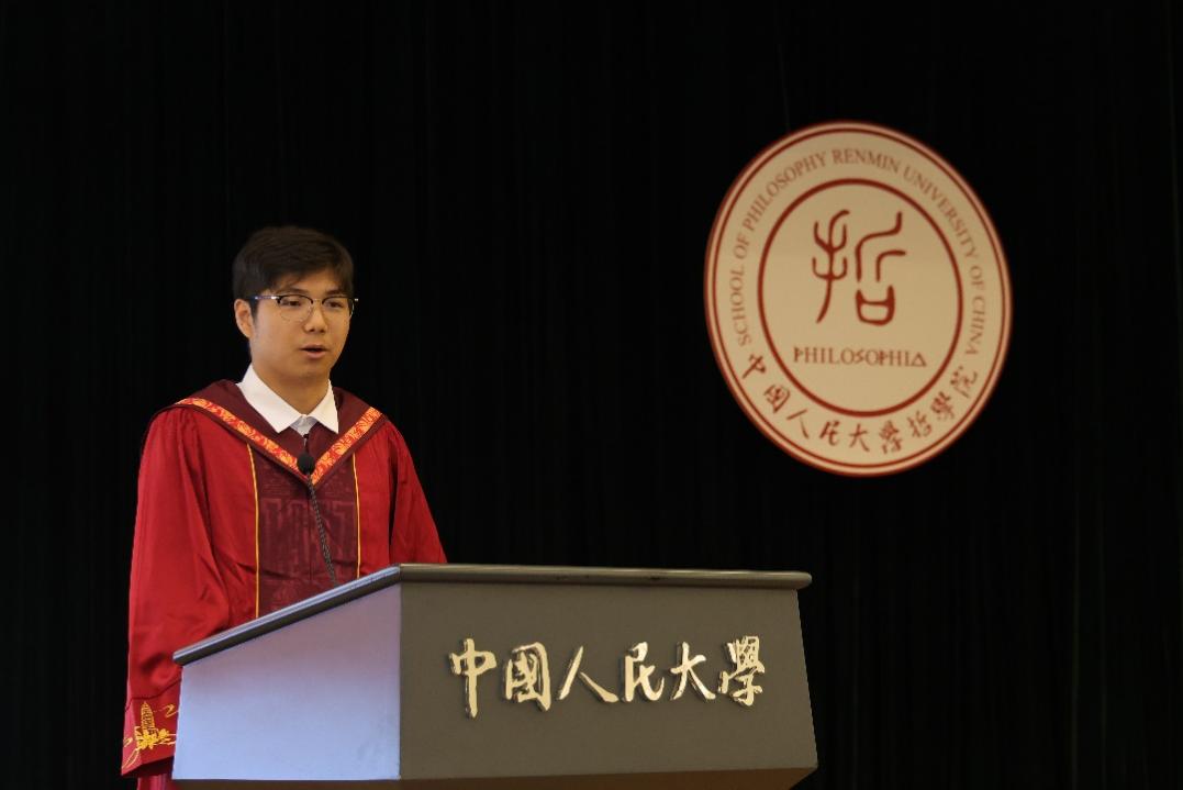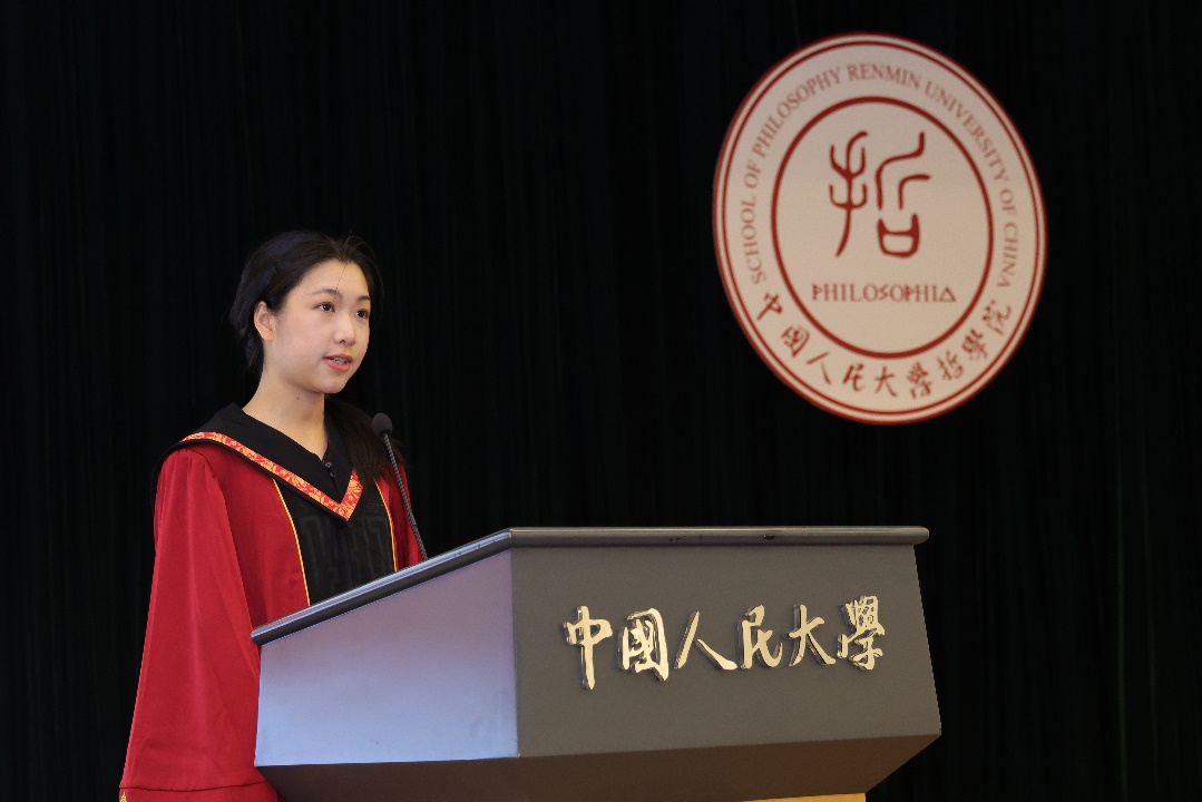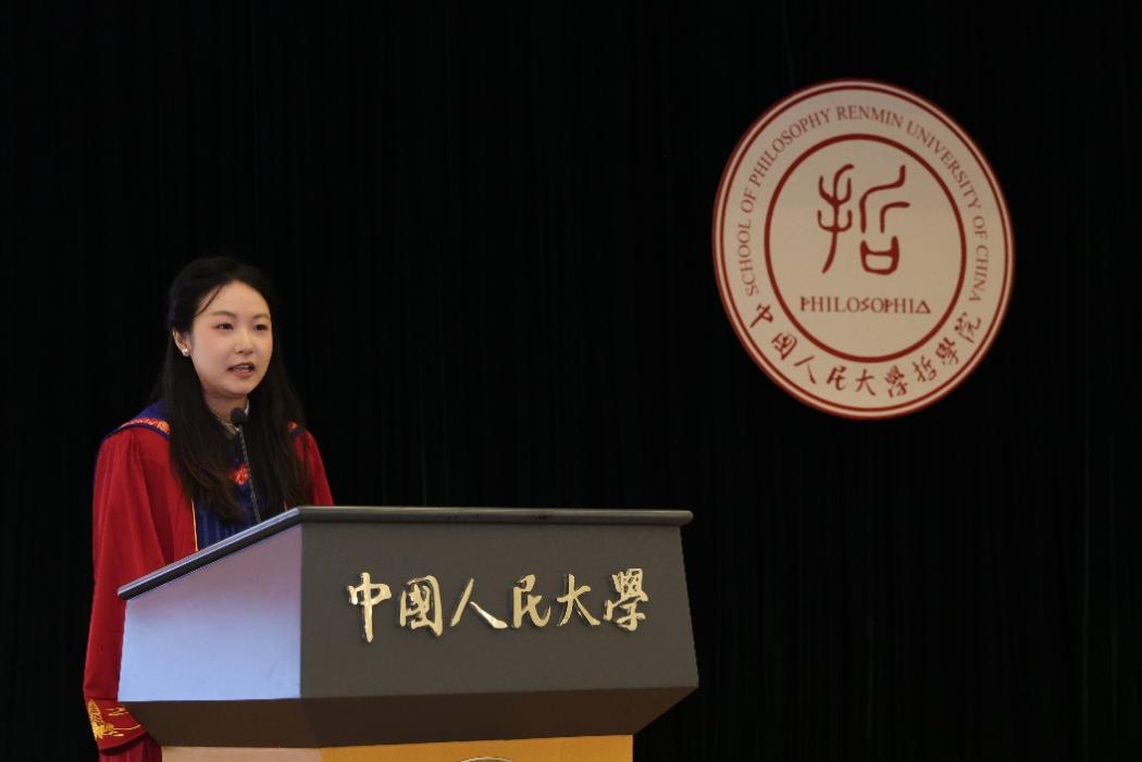 硕士毕业生代表郝玲从人大人的使命担当、哲学学科的优秀品格、从书斋走向广阔天地的实践三个维度回顾了成长历程。她表示,母校教会了我们以实事求是的精神、敢为人先的勇气、坚韧不拔的定力,直面时代与人生的问题。未来的哲院学子要继续做开路的先锋、事业的闯将、民族的脊梁,将哲学的生命之火点燃在祖国大地上。