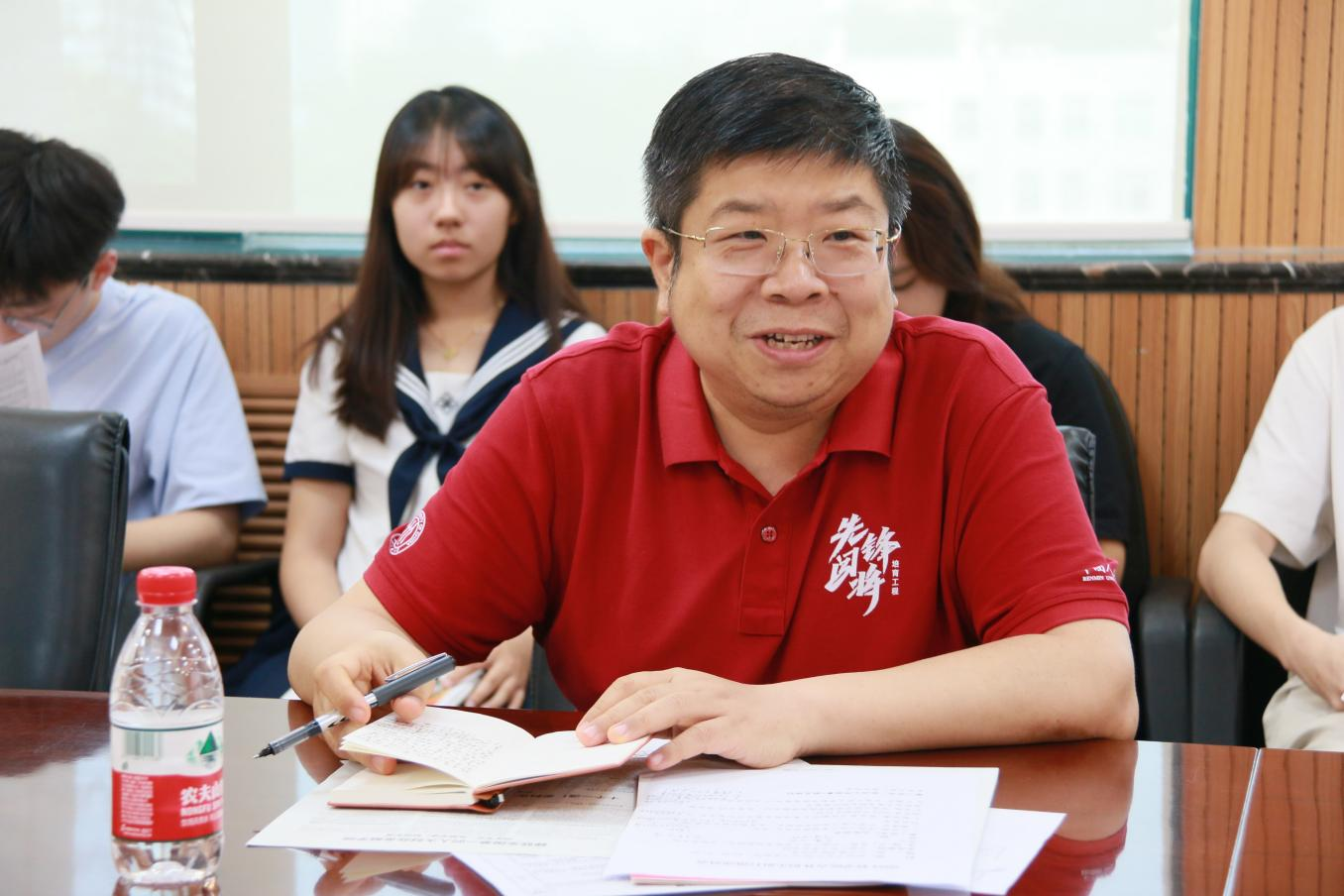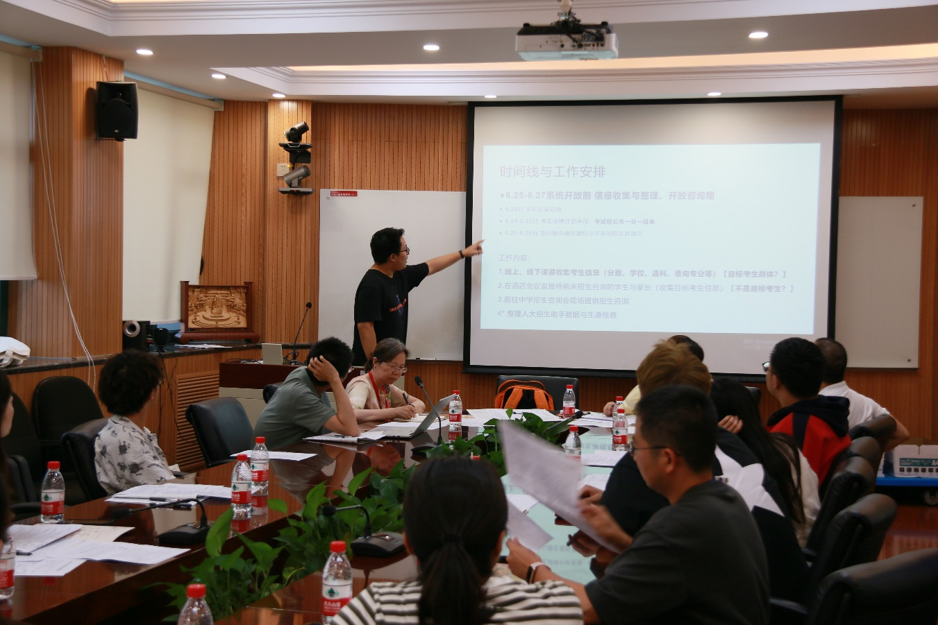 历史组负责人王俊淇、物理组负责人武岳、学生团负责人杜旭韬为招生组师生作行前培训。